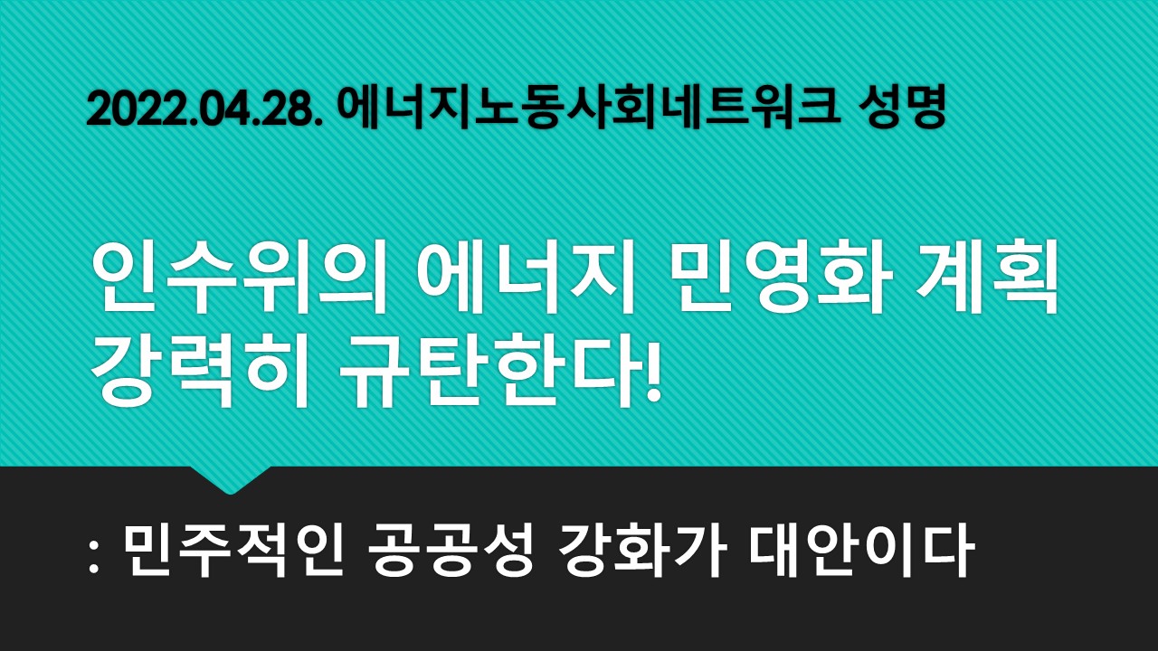 에너지노동사회네트워크는 인수위가 발표한 에너지 정책을 강력히 규탄한다. 이번 발표는 “정상화”라는 탈을 쓴 “민영화” 계획이다. 인수위는 불평등을 악화시키고 정의로운 전환을 가로막는 에너지 민영화 계획을 철회하라. 그렇지 않다면 원전과 민영화를 중심으로 한 윤석열 정부는 시작부터 노동자와 시민들의 거대한 저항에 직면할 것이다.